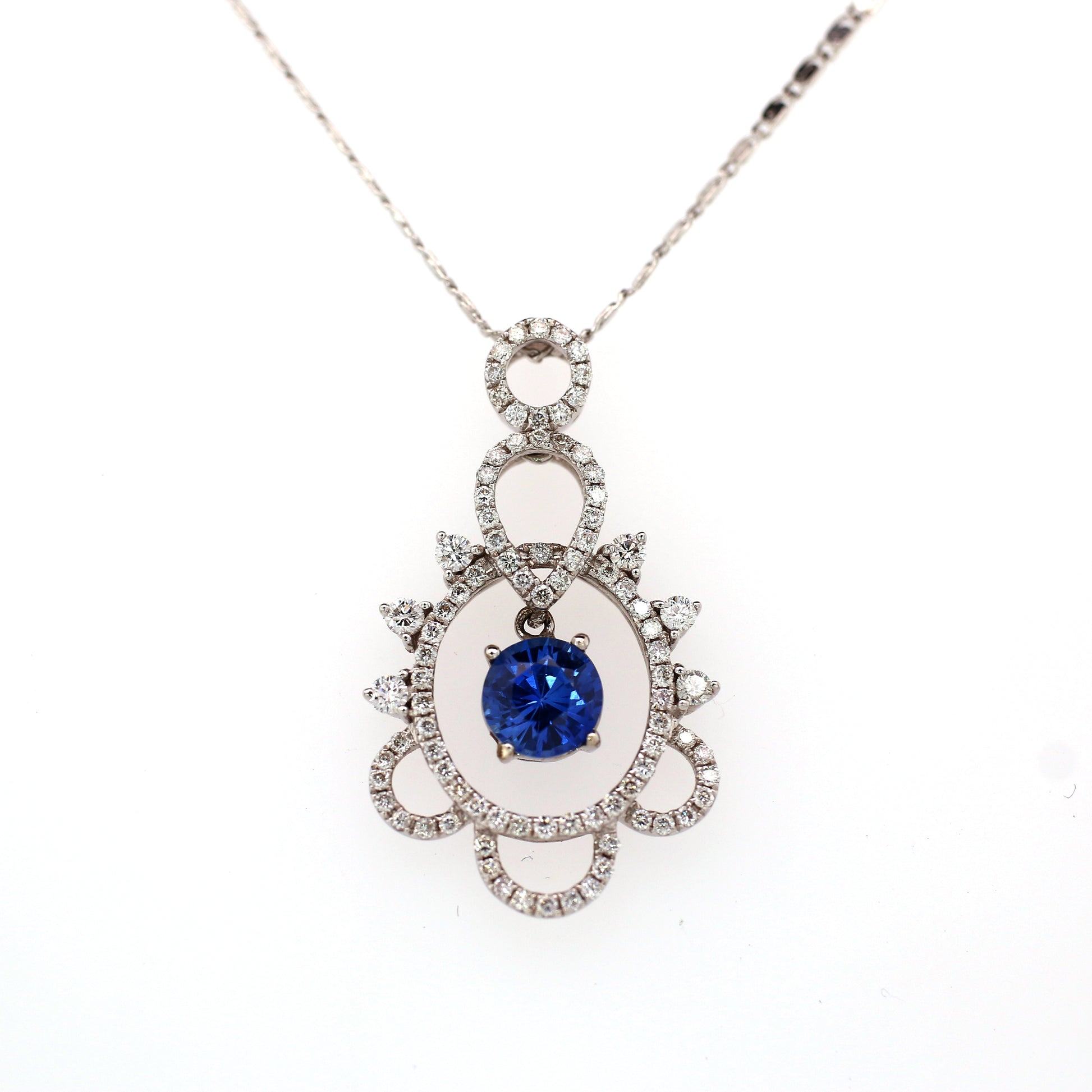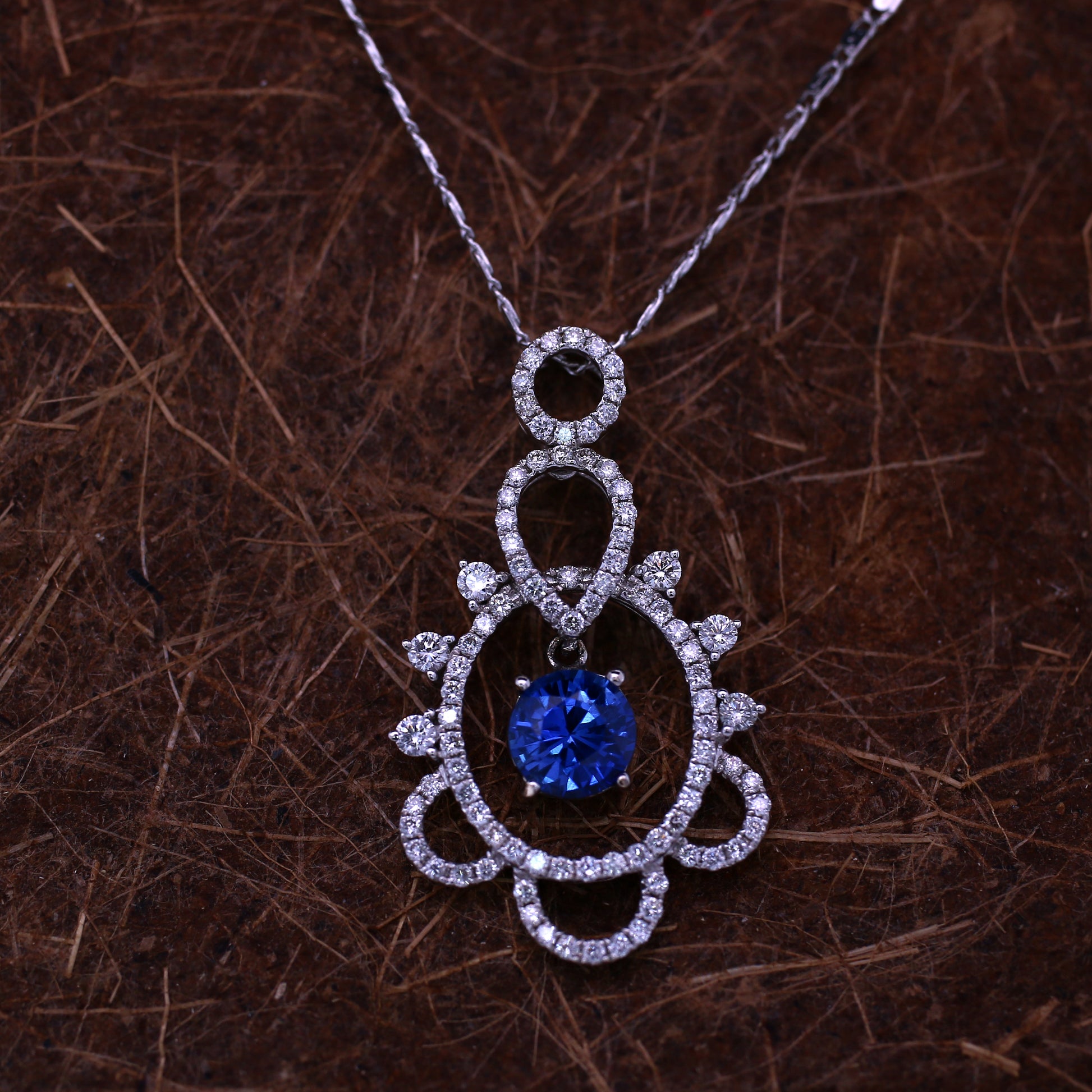 Natural Blue Sapphire pendant in 18K White Gold. It has a Round Faceted cut Sapphire studded with halo of diamonds that completes your look with a decent touch.